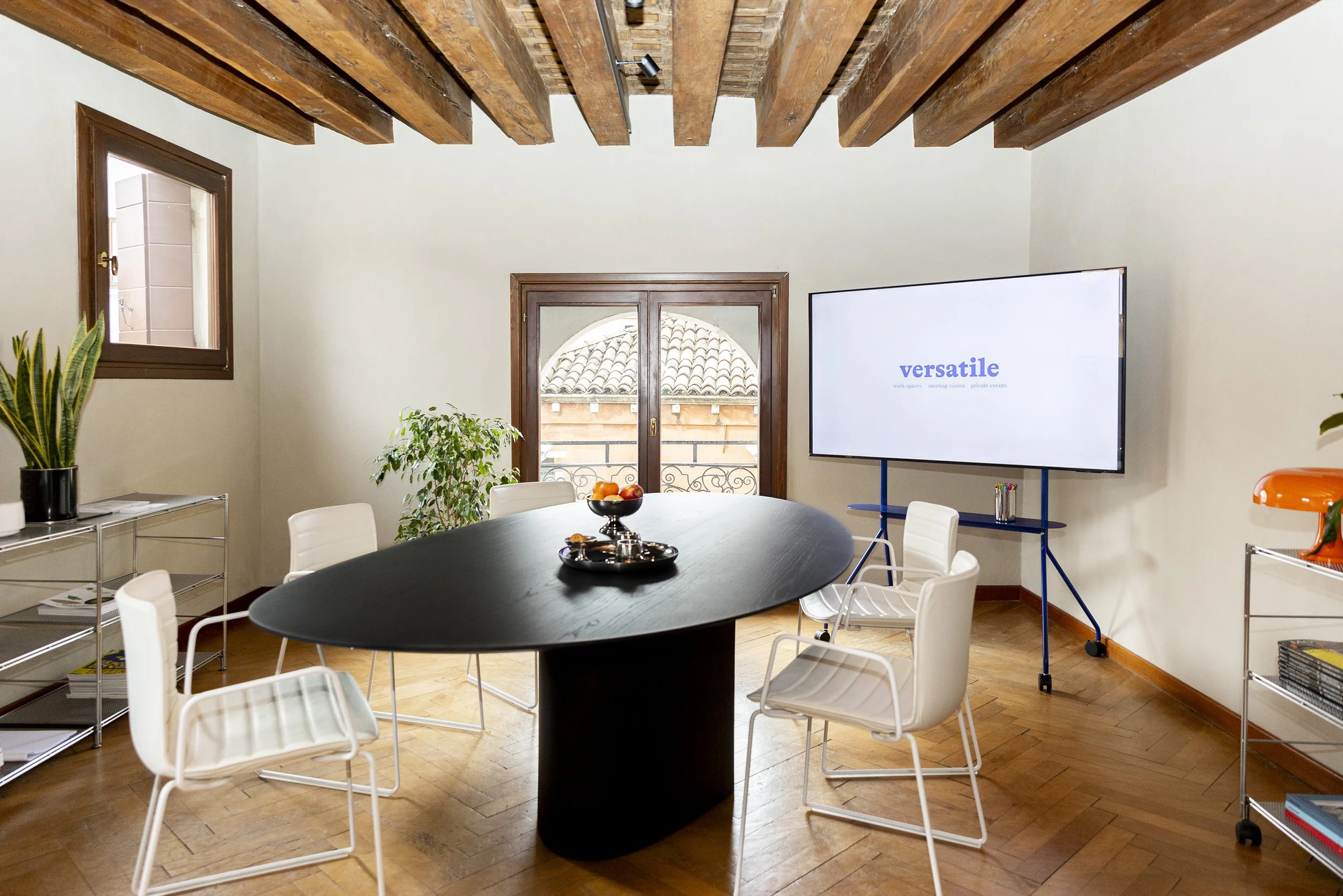 Our Meeting Room is the perfect space for hybrid and distributed teams to step out of routine, align on strategy and values, and explore new ways of working together. Strategically positioned only 5 minutes from Rialto bridge and hosting up to 8 people, it’s a private, curated space to foster creativity, connection, and innovation, ideal for focus sessions during corporate retreats and offsites in Venice.